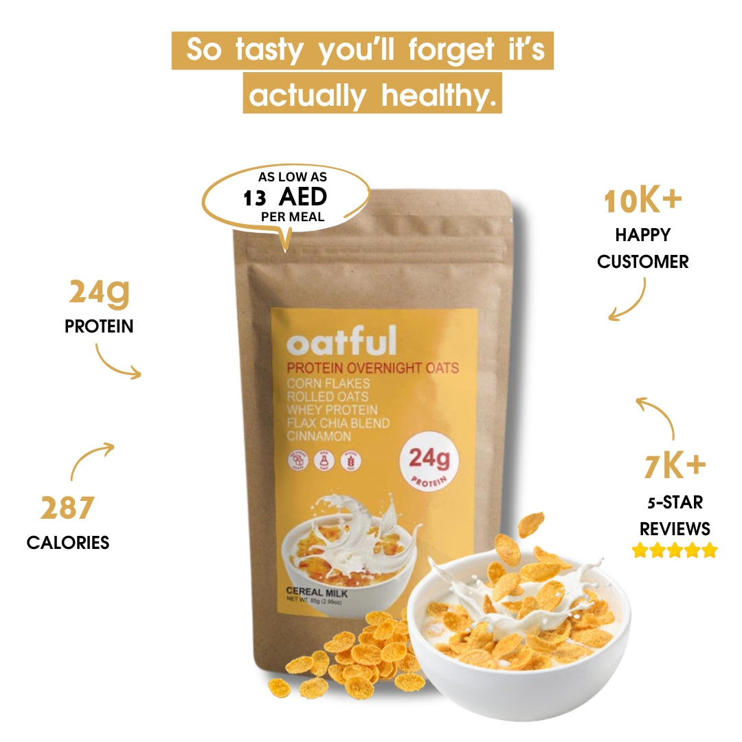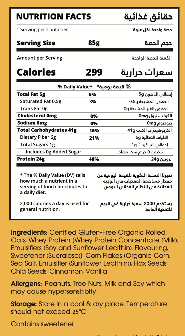 5 REAL INGREDIENTS: Rolled oats, whey protein, cornflakes, flax & chia, cinnamon