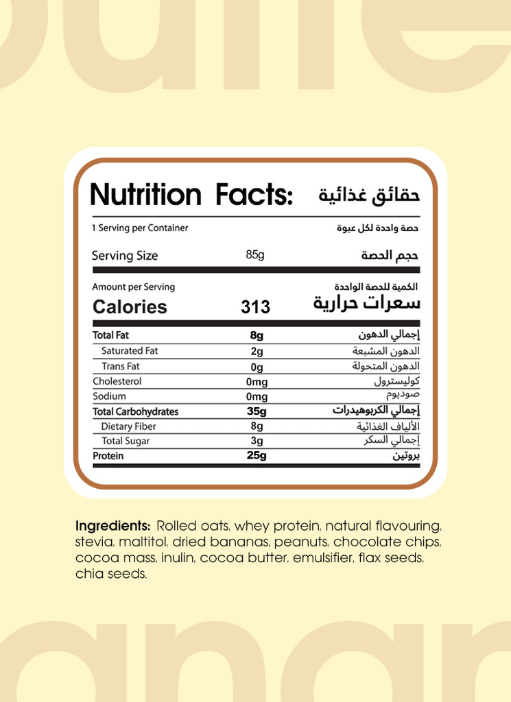 6 REAL INGREDIENTS:Â Rolled oats, cacao, banana, peanuts, chia seeds, flax seeds