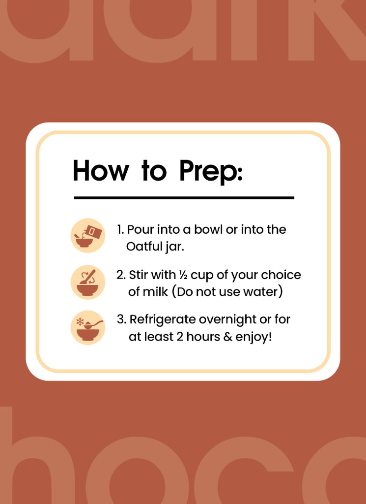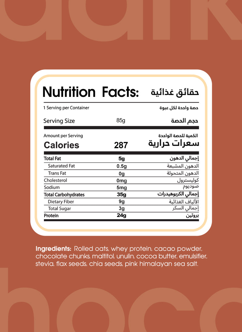 6 REAL INGREDIENTS: Rolled oats, whey protein, cacao, sea salt, dark chocolate chunks, flax & chia seeds