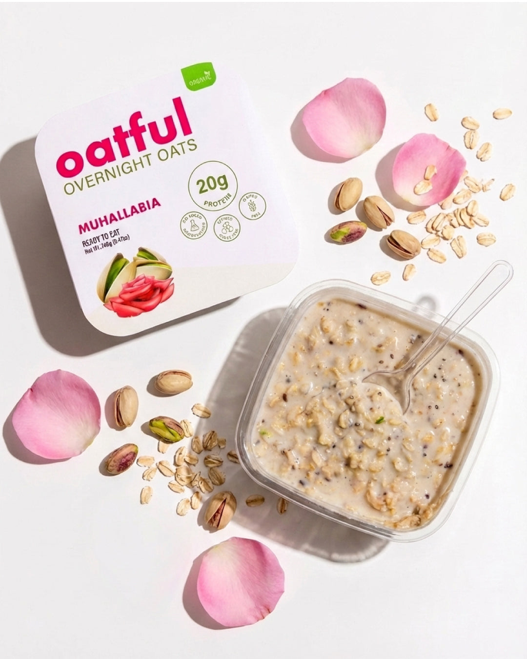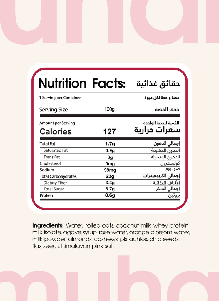The nostalgic dessert, reimagined and upgraded. Oatful’s Muhallabia Protein Overnight Oats deliver 20g of protein per serving—over three times the protein of leading brands. Made with premium oats, creamy coconut milk, rose and orange blossom water, and chopped pistachios, it offers a rich, pudding-like texture with zero added sugar and only clean ingredients. Satisfying, wholesome, and effortless—this is suhoor, perfected.